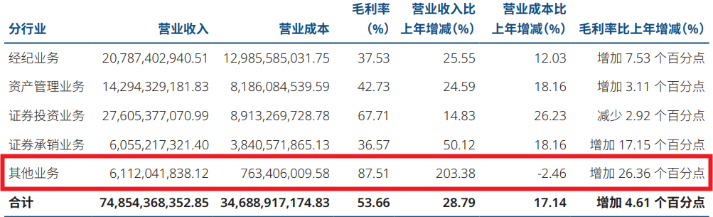 具体来说,经纪业务仍然占大头,全年实现收入207.87亿元,同比增长25.55%;资产管理业务实现收入人民币142.94亿元,同比增长24.59%;证券投资业务实现收入人民币276.05亿元,同比增长14.83%;其他业务实现收入人民币61.13亿元,同比增长203.38%。