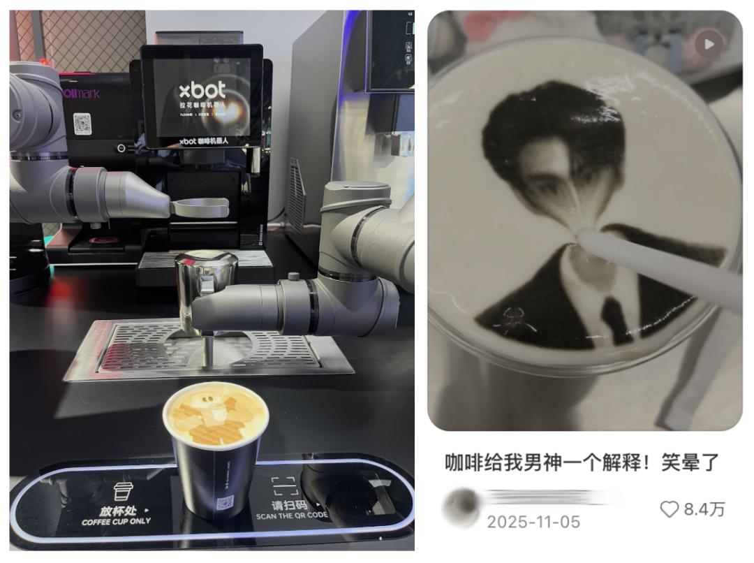 如果担心光吃煎饼容易晕碳,你还可以让 xbot 拉花咖啡机器人为你做一杯 16.9 元的拿铁,如果想要扫码定制专属印花,还得再额外加 9 元。