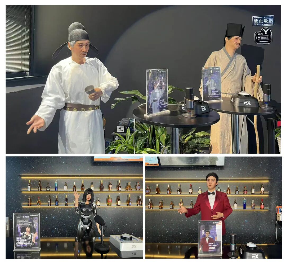 这里有迎宾接待的机器人酒保 “希尔”、精通七国语言的机器人 “小柒”、表演诗歌脱口秀的机器人 “李白” 和 “苏轼”、精通物理理论的机器人 “牛顿”、负责演奏和跳舞的机器人乐队、还有满地蹦跶来找你蹭蹭的机器狗、机器恐龙等,连送餐、取擦手纸、垃圾桶,也都是机器人。