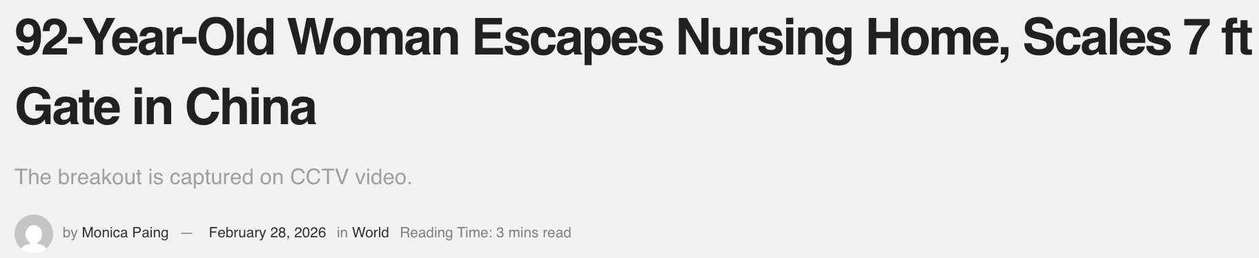 养老院负责人表示,事发当日,老人从开始翻越到完全越过铁门,全程仅用时24秒。她动作轻巧,如“行云流水”。负责人感叹,连他自己都不敢翻这扇大铁门,没想到老人家却像走平地一样轻松越过。
