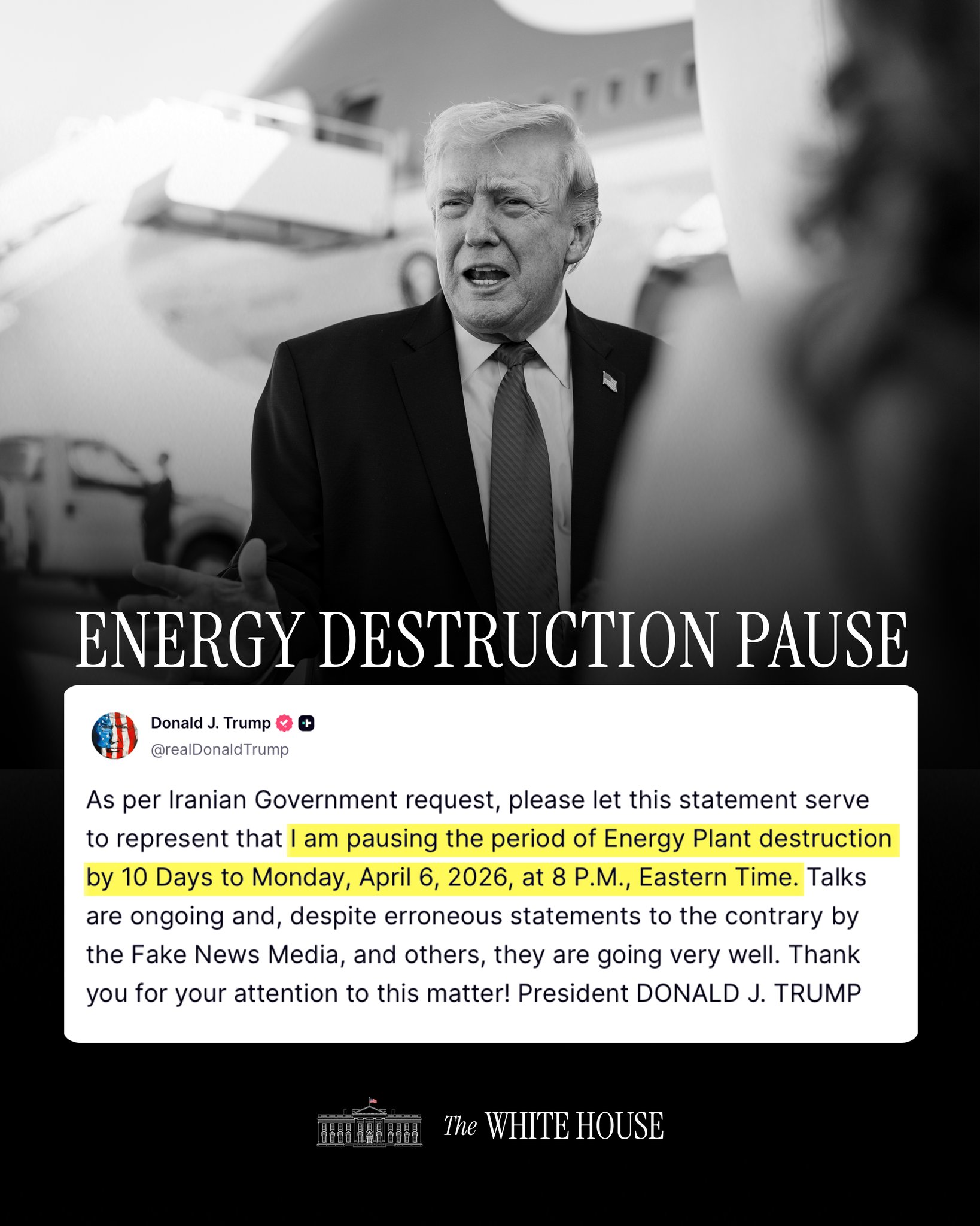 川普称,“应伊朗政府请求,特此声明,我将对伊朗能源设施的摧毁期限推迟10日,至美东时间2026年4月6日周一晚上8点。谈判正在进行中,尽管假新闻媒体和其他一些人发表相反的错误声明,但谈判进展非常顺利”。