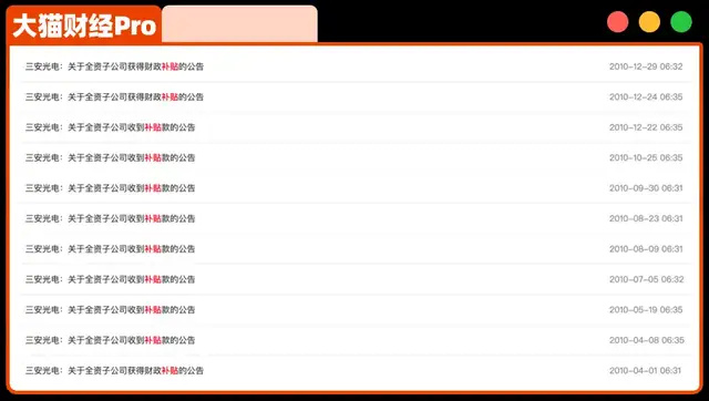 坊间猜测不少,说是跟补贴相关,毕竟三安有个绰号是A股的“补贴之王”,上市之后拿了110多亿的补贴,很多大国企看了都眼红。