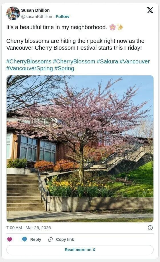 小伙伴们注意了,温哥华樱花节将于本周五开始举办第 20 届年度樱花节,而列治文樱花节将于 4 月 12 日举行。