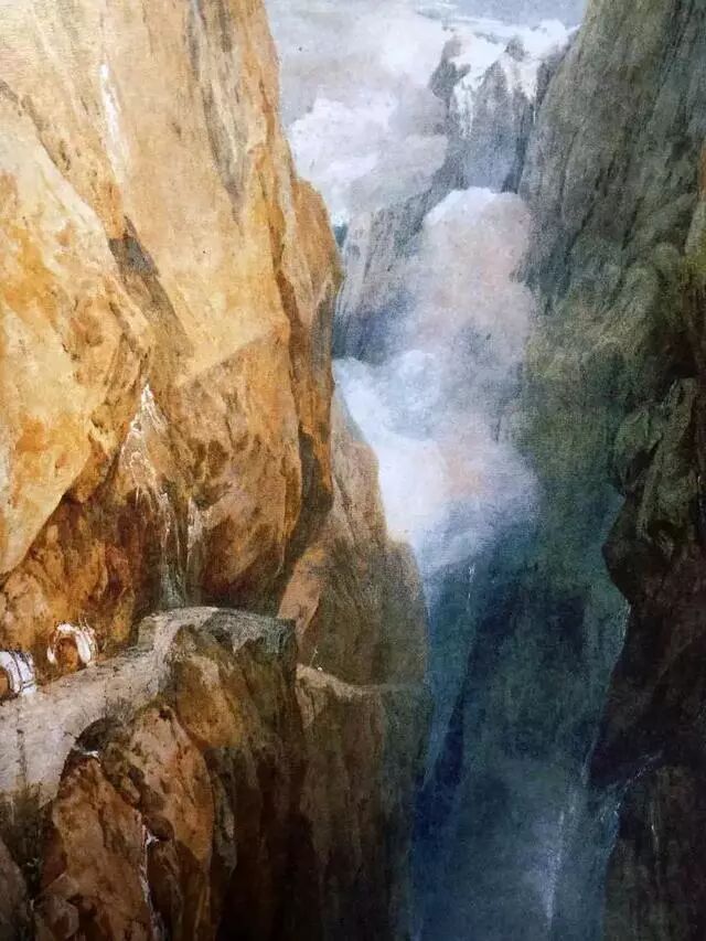 冷暖色调的对比,大师非常喜欢的一种色彩表现形式。在左栈道的石桥刻画的石制质感,非常见功力。