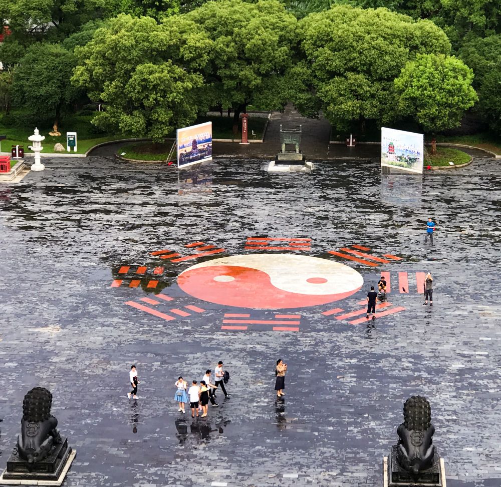 从七层阁楼向下看,楼下庭院中太极八卦图装饰的地面和一对石狮端坐。