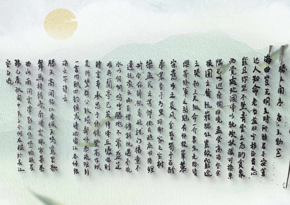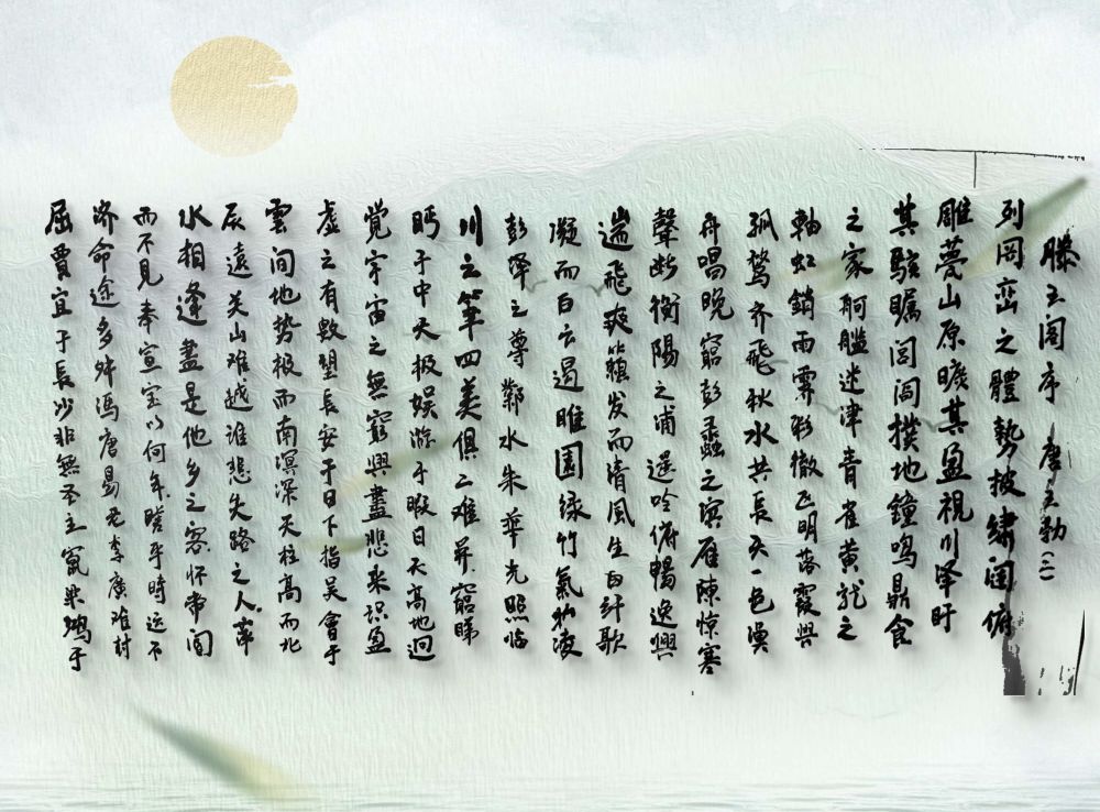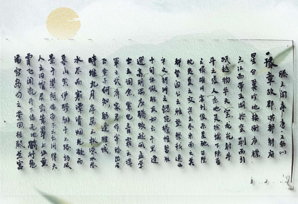 王勃这篇《滕王阁序》通篇用典,华丽工巧又不失自然典雅,实在是不可多得的骈文佳篇。我用生宣手抄后卷了起来,今天拿出来拍,发现纸皱字斜实在没法看;就做了后期勉强修补了下背景,希望能让诸位有稍好一点的观看体验。