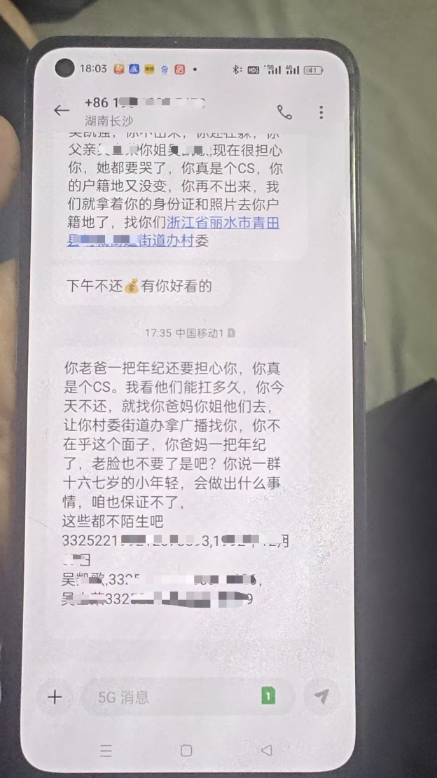 那时,该催债人还不知道吴凯强已经死亡。他继续发短信给吴凯强亲友,“你说一群十六七岁的小年轻,会做出什么事情,咱也保证不了。这些都不陌生吧?”
