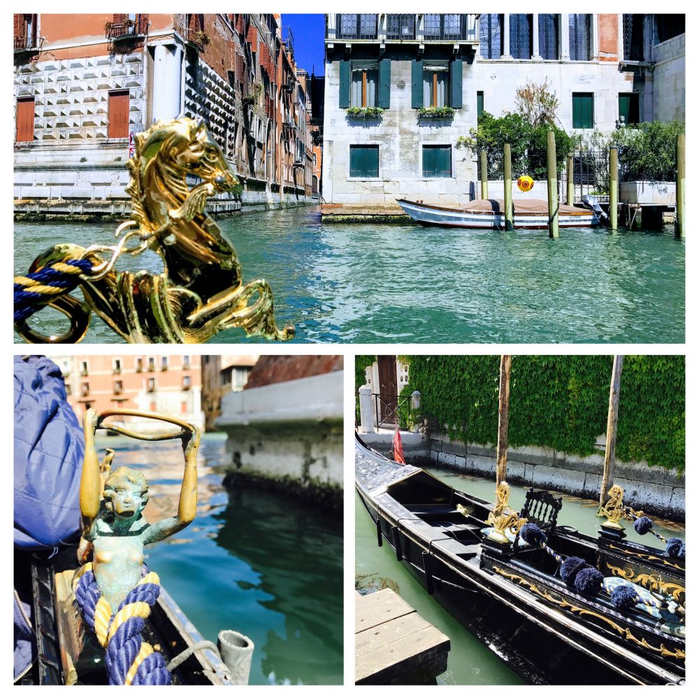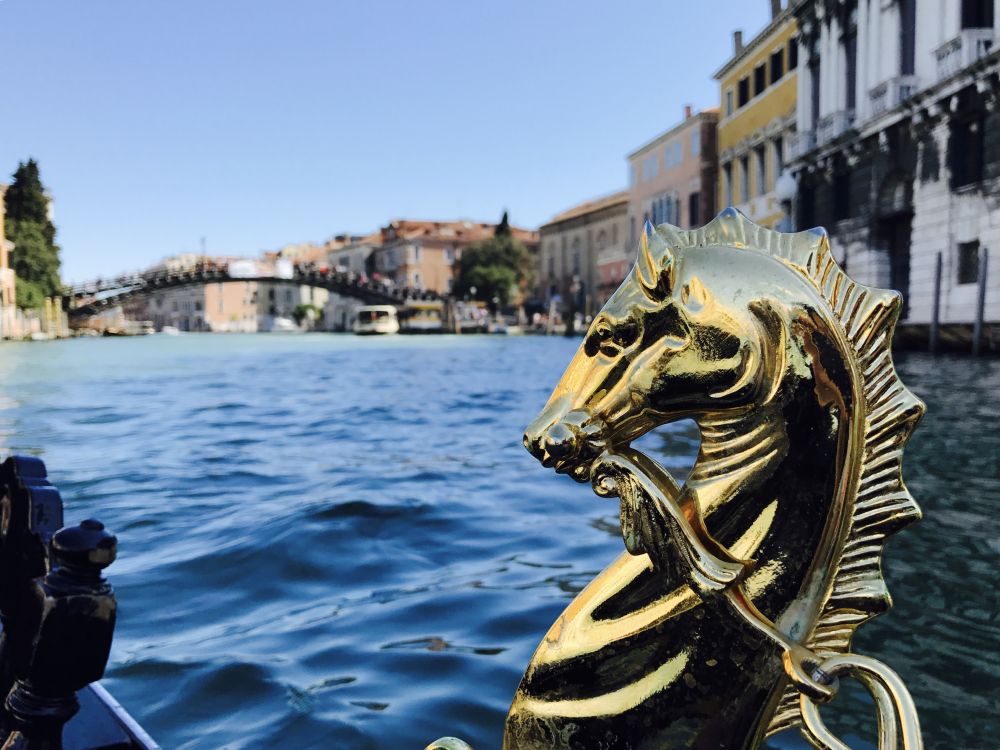 船夫先是带着我们在幽长狭窄的水巷中摇曳,从一个个小桥洞下地穿越划出,最终驶进了威尼斯的大运河。此时,我用手机对船头的骏马拍个不停,在蓝色河面的衬映下,它就像一匹拼命地要挣脱缰绳的千里马,也像我那即将奔放而飞驰的心情。