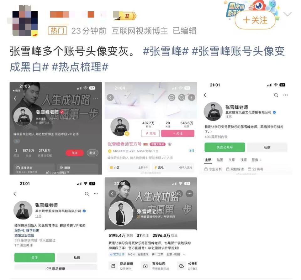 张雪峰的微博、抖音、小红书,所有平台头像齐刷刷变成黑白。