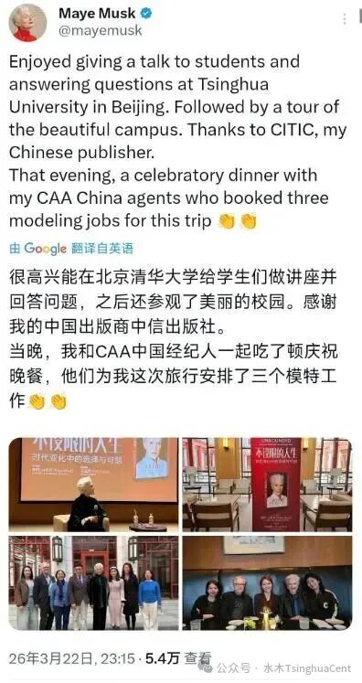 “很高兴能在北京清华大学给学生们做讲座并回答问题,之后还参观了美丽的校园。”梅耶在社交媒体上晒出照片并配文写道。她还透露,这次中国之旅安排了三个模特工作,“感谢我的中国出版商中信出版社”。