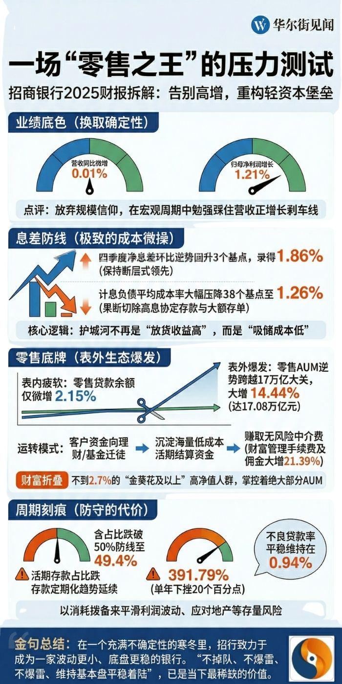 在规模信仰坍塌的宏观周期里,招商银行交出了一份“告别高增,换取确定”的答卷。2025年,招行营收同比微增0.01%、归母净利润增长1.21%;