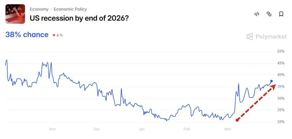 宏观层面,Polymarket数据显示2026年经济衰退概率已升至36%,利率与黄金均呈防御性交投态势。Privorotsky指出,MOVE指数昨日再度下行3个点,但这一走势越来越多地反映的是增长预期的下修,而非单纯的避险情绪。