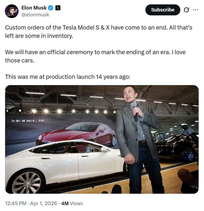 马斯克4月1日在X平台发文称:"特斯拉Model S与Model X的定制订单已经结束,剩余的只有部分库存车。"他同时表示将举办正式仪式纪念这一时刻,并配发了14年前两款车型量产启动时的旧照,写道:"我爱这两款车。"