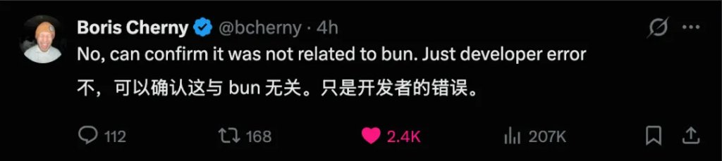Claude Code 的负责人在 X 上回应:“这不是 Bun 相关的安全漏洞,没有用户数据泄漏,只是开发者的错误而已。”
