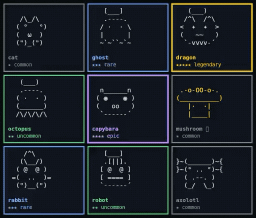 Claude 一共设计了鸭子、鹅、猫、章鱼、猫头鹰、企鹅、乌龟、蜗牛等 18 个电子宠物,就像抽卡一样,不同的宠物有不同的等级,例如我们抽到的是两颗星的 uncommon,还有 common、rare 稀有等不同品类。