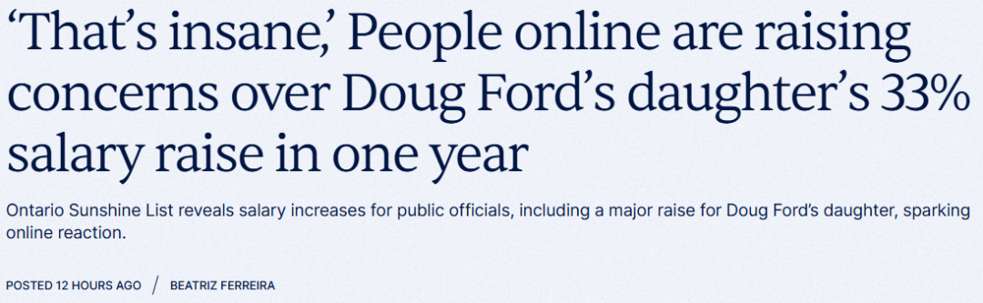名单显示,省长道格·福特(Doug Ford)的员工薪资在2025年有所上涨,而他女儿的年薪更是在短短一年内暴涨超过33%,引发不少争议。