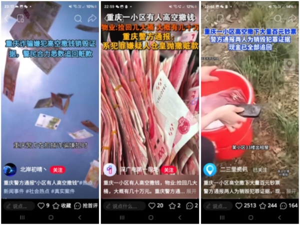 近日大陆重庆市九龙坡一个小区突然出现高空抛大量百元大钞的奇景,在网上引起关注热议,事后警方通告称犯罪嫌疑人抛撒赃款所致。