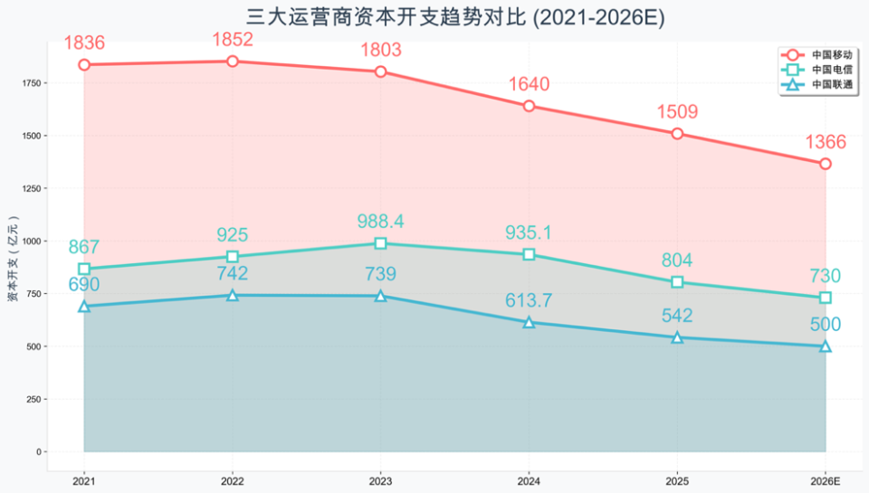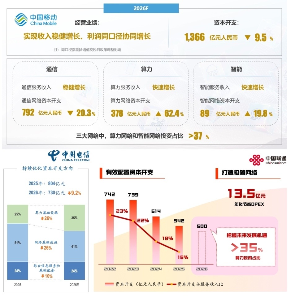 数据显示,2026年三大运营商的资本开支计划约为2596亿元,较2025年同比减少9%。不过从资金的具体投向来看,三大运营商正在释放出清晰的信号,面向AI时代,夯实网络基础设施的同时,加强算力基础设施建设,探索智能应用,进而实现从“流量经营”到“价值经营”的战略转型。
