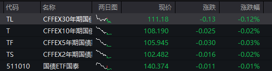 债市:国债期货全线下跌,截至发稿,30年期主力合约跌0.12%,10年期主力合约跌0.02%,5年期主力合约跌0.03%,2年期主力合约跌0.02%。