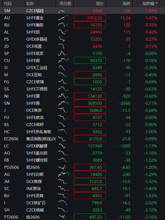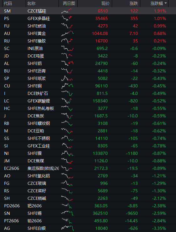 商品:国内商品期货多数品种下跌,截至发稿,锰硅涨2%,燃油、沪金、橡胶、沪铝、多晶硅、鸡蛋等品种走高,沥青、沪铜、焦炭、不锈钢、焦煤、沪镍、集运指数、热轧卷板、豆粕、工业硅、卵唐钢、原油等下跌,碳酸锂、玻璃、氧化铝、铁矿石、烧碱等跌超1%,钯金、铂金、沪铝、沪银等跌幅居前。