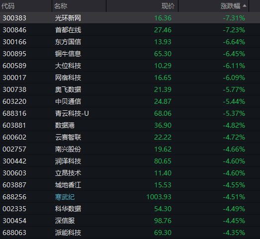下跌方面,影视股下挫,金逸影视跌停;算力租赁概念调整,优刻得、光环新网跌超7%。