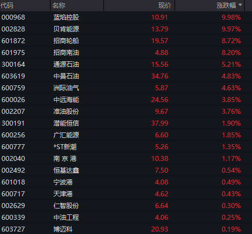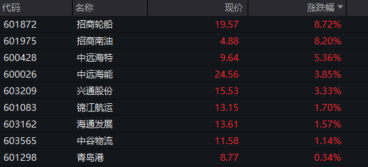 航运板块再度活跃,油运方向领涨,招商轮船触及涨停,创历史新高,中远海能、国航远洋、招商南油、安通控股、盛航股份跟涨。