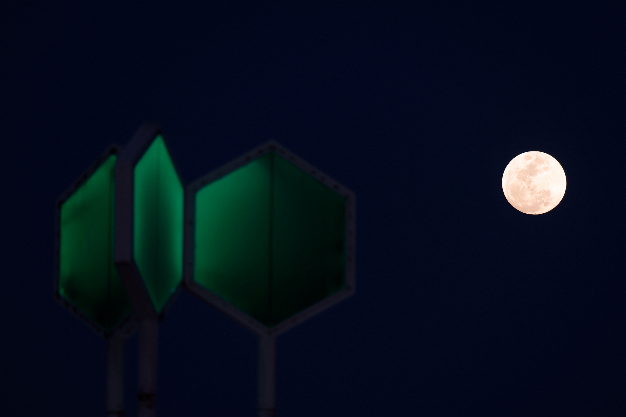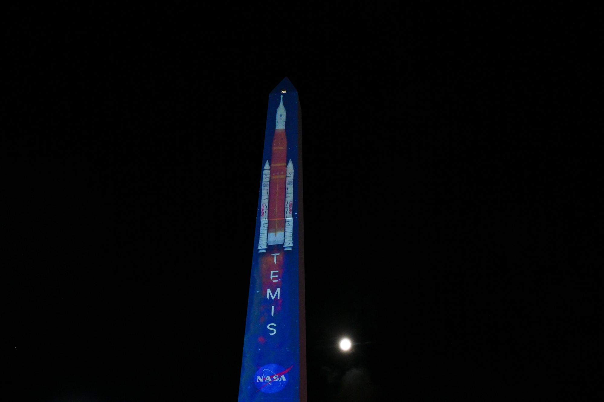 2026年4月1日晚间,在美国宇航局的“阿尔忒弥斯二号”任务火箭从佛州肯尼迪航天中心成功升空后不久,“粉红月亮”从任务时钟的上方缓缓升起。(Gregg Newton / AFP via Getty Images)