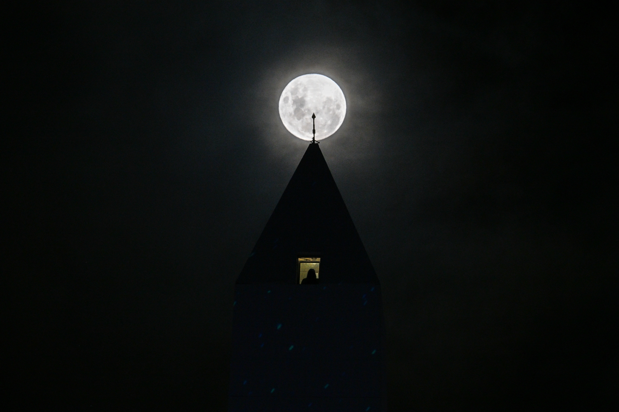 2026年4月1日晚间,在布宜诺斯艾利斯市中心的方尖碑展示美国宇航局“阿尔忒弥斯二号”任务火箭发射升空的投影影像期间,一轮皎洁的圆月从其后方缓缓升起。(Luis Robayo/AFP via Getty Images)2026年4月1日晚间,一个人从阿根廷首都布宜诺斯艾利斯市中心的地标性建筑方尖碑的观景台上观看“粉红月亮”。(Luis Robayo/AFP via Getty Images)2026年4月1日晚间,一轮圆月高悬在阿根廷首都布宜诺斯艾利斯的夜空中,一只鸟和一架无人机与其罕见同框。(Luis Robayo/AFP via Getty Images)