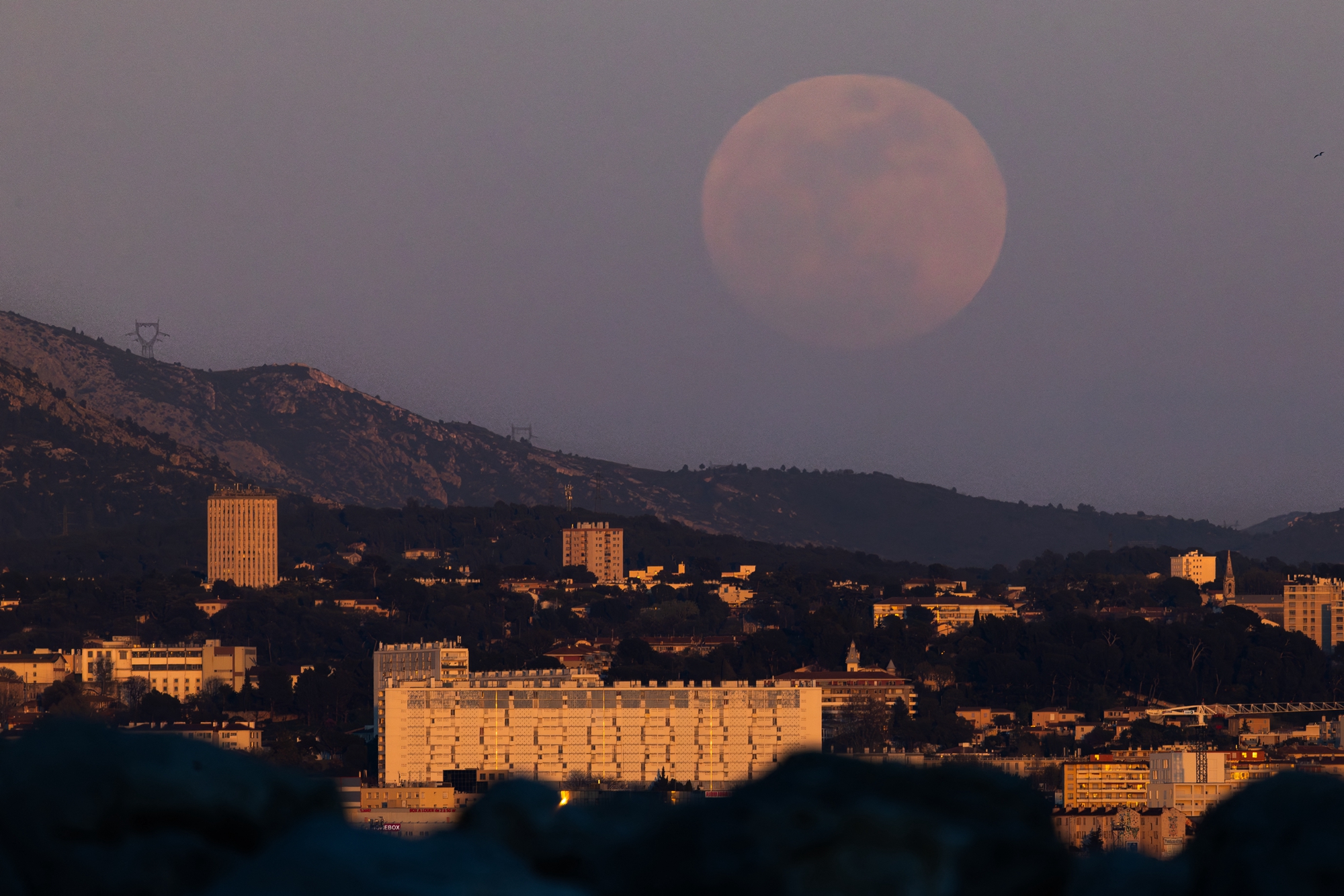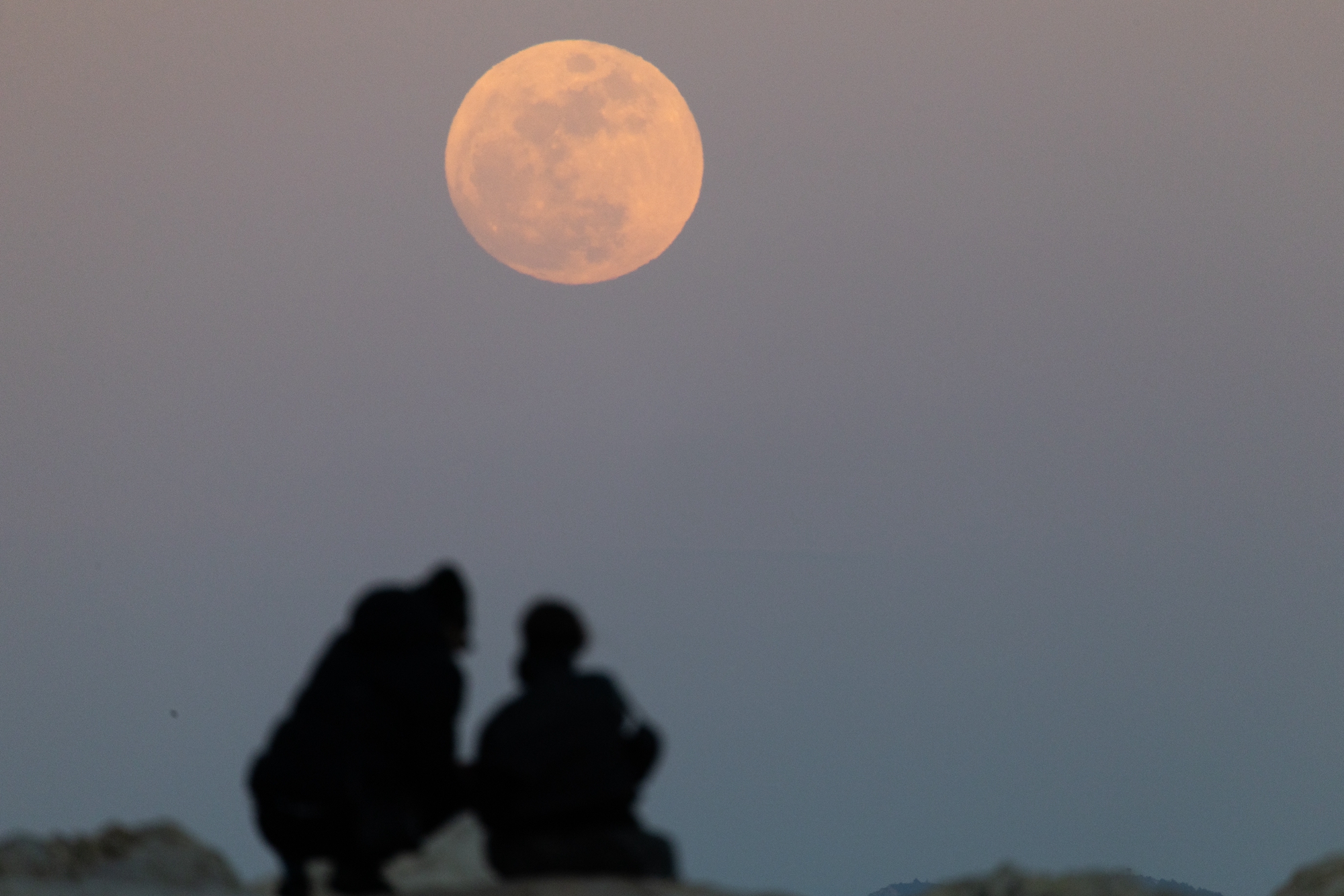 2026年4月1日晚间,一轮硕大的圆月从法国东南部港口城市马赛(Marseille)的夜空中缓缓升起。(Thibaud Moritz/AFP via Getty Images)2026年4月1日晚间,一对夫妇在法国东南部港口城市马赛(Marseille)观看夜空中的“粉红月亮”。(Thibaud Moritz/AFP via Getty Images)