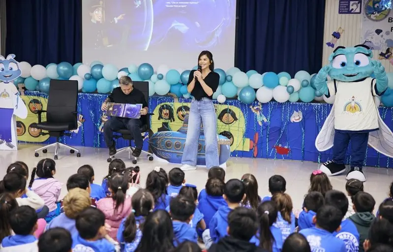 活动在学校多功能活动室举行,现场铺设红地毯,气氛隆重而热烈。桑切斯现场朗读了她的最新作品The Fly Who Flew Under the Sea,带领学生进入充满想像力的深海世界。随着故事推进,学生们情绪高涨,齐声高喊“Flynn,Fly!”,与书中角色一同展开奇幻旅程。