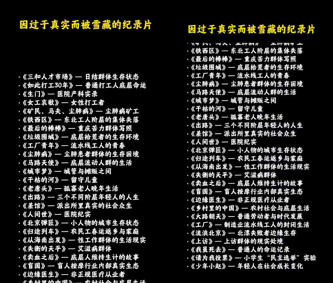 据这份清单显示,相关作品横跨近三十年,涵盖农民工、尘肺病患者、基层执法、流动人口、历史创伤等题材,包括《三和人才市场》《最后的棒棒》《铁西区》《上访》《差馆》《人间世》《请为我投票》纪录片等。多数作品曾在影展或小范围传播,但在中国大陆难以持续公开呈现。