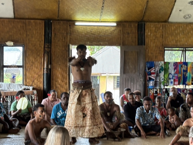 斐济的一个偏远村庄。原住民的舞蹈和欢迎仪式。游客中推出一个临时酋长,他(或她)负责喝下当地人敬给游客酋长的用手挤出的一种饮料(kava)。这种饮料有放松神经的效果。大概算是一种软性毒品。加州也有这东西。据说当地部落历史上有吃人习俗,到二十世纪才结束。