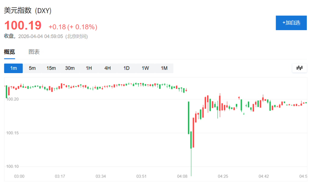 纽约尾盘,ICE美元指数微涨0.1%,非农数据公布后瞬间拉升至100.160刷新日高,随后回落至100下方。