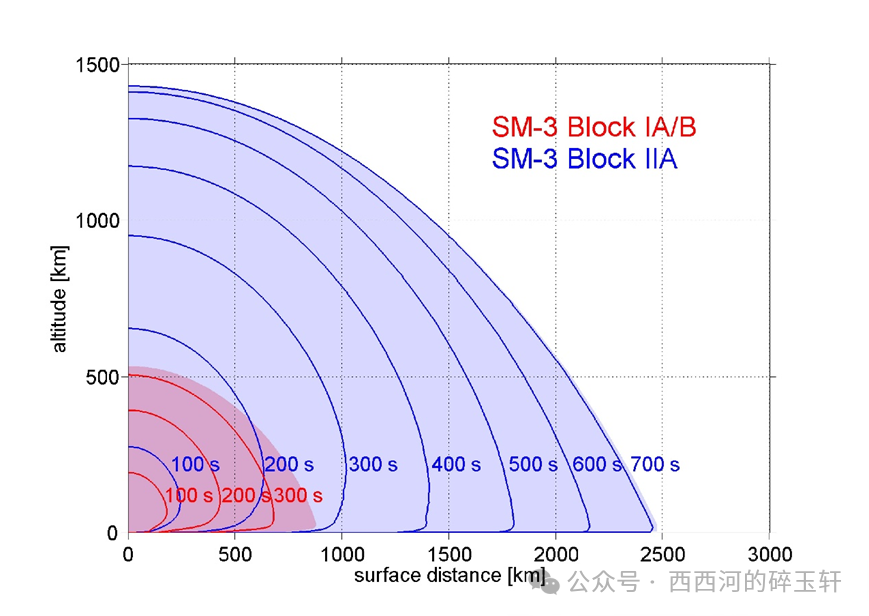 “标准”-3 Block IIA 的第二级、第三级固体火箭助推器弹径有所增大,导弹的机动性有所提高,大气层外动能拦截弹头最高飞行速度约 15 马赫左右,理论上可拦截射程在 3000 公里至 5500 公里的中程弹道导弹。