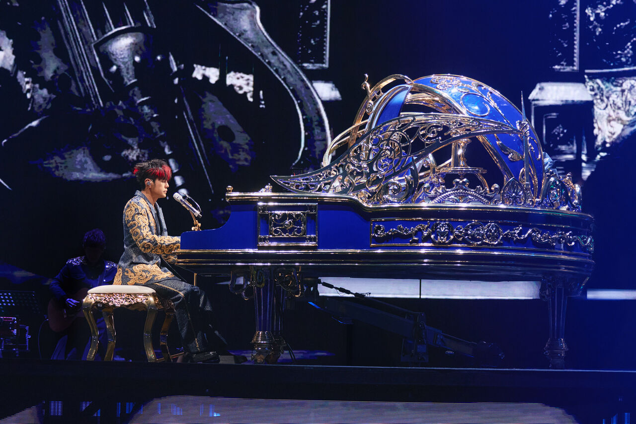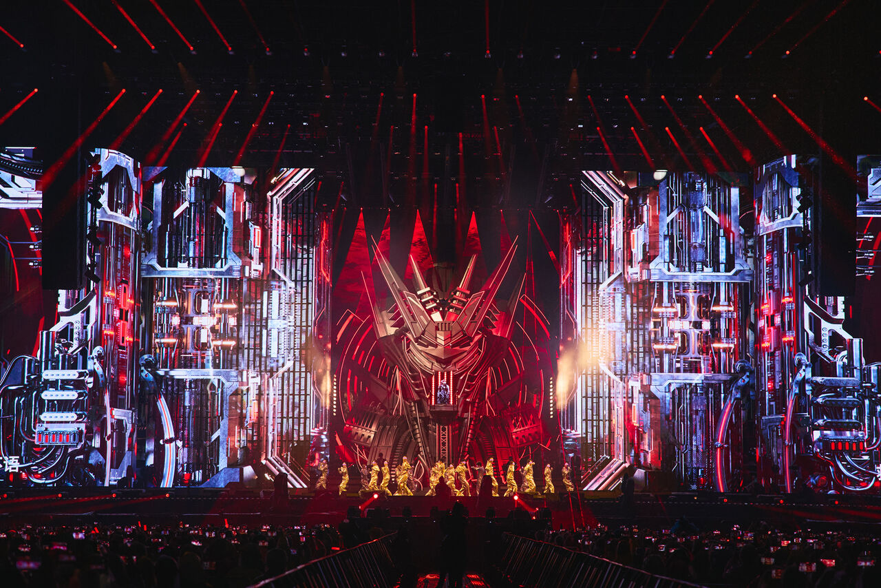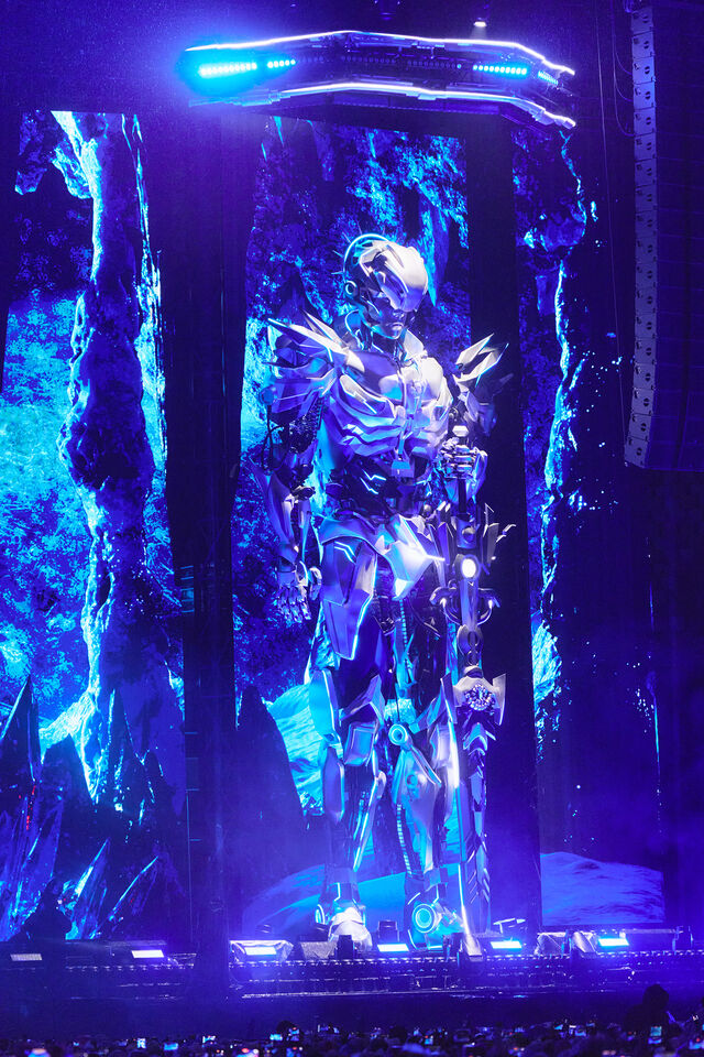 开场以视觉特效打造的“冰封世界”,随着大雪融化、激光光切出了一道门,“环状炸水”特效喷发,随之映入眼帘的是14米高巨型机甲,当机甲开启它的座舱,周杰伦以王者归来的气势,一连带来新歌〈太阳之子〉、〈无双〉两首歌曲,气势非,周董与28位身着萤光服的舞者,以热力四射的舞蹈,燃爆全场粉丝热情。