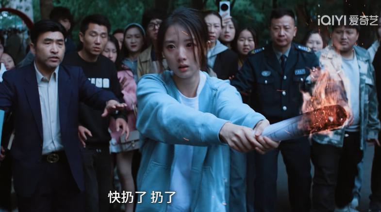 她因被取消答辩资格,精神崩溃用火点着学习资料,一边大喊“有妖精”一边挥舞着手中的东西。