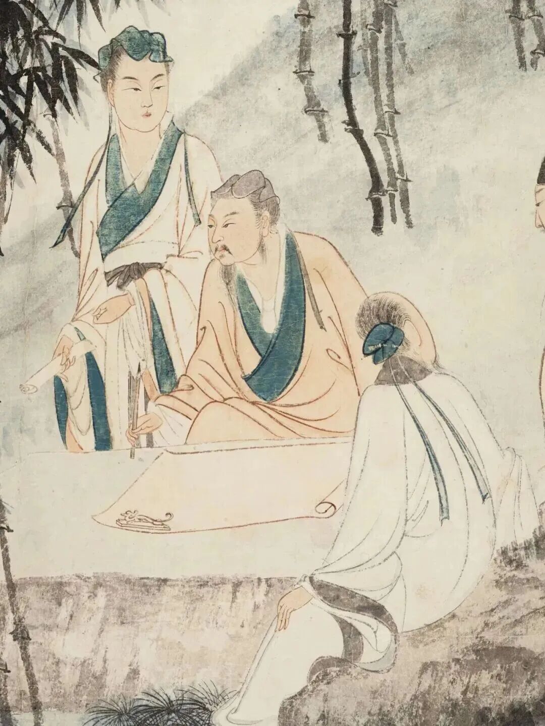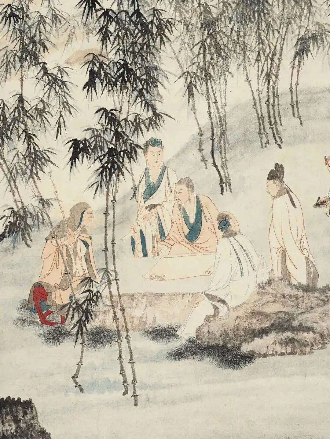 竹林茂密,溪水清幽,六位文人聚在一起,喝酒吟诗,谈天说地。