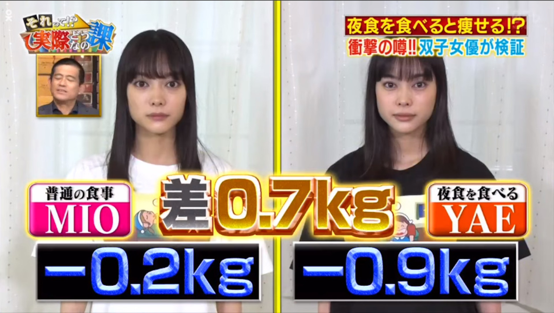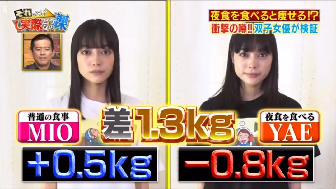 节目组找来一对双胞胎姐妹“MIO”(姐姐)和“YAE”(妹妹),请她们吃一模一样食物,而妹妹这边则会再加一餐夜宵。连续三天后,观察两人的体重变化。