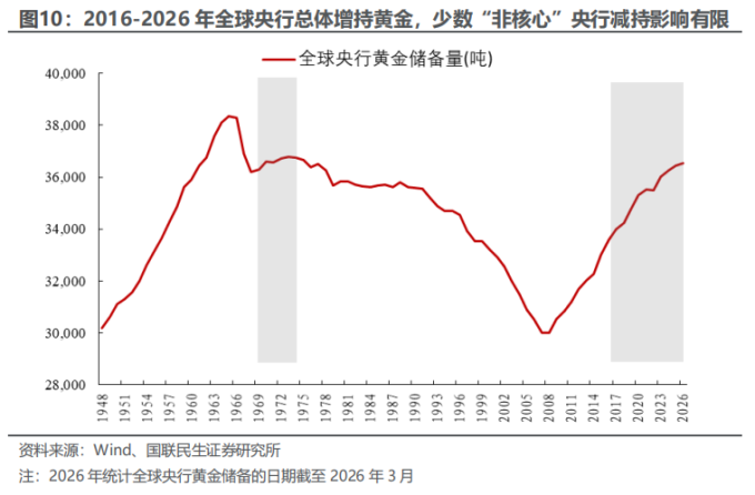 其一,3月全球仍在“净买入”黄金,某些央行减持不影响“央行购金”的主旋律。美伊冲突爆发后,2026年3月全球央行购金达到14.7吨,其中欧元区为本月“购金主力”(43.1吨),其余央行增持黄金量远超土耳其、俄罗斯减持黄金量。综上所述,部门央行的“减持”行为不影响“央行购金”的主基调。