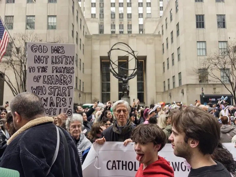 纽约街头从来不缺政治表达,而在美伊战争持续延烧的当下,彩帽游行也成了呼吁反战、和平的阵地。天主教徒拉起横幅,举起标语,引用罗马天主教宗良14世(Pope Leo XIV)的宣言指,发起战争的领导者“双手沾满鲜血”,“上帝绝不会听取这些人的祷告”。也有市民将头饰设计成有和平鸽停留的地球仪,“(和平)是我们现在最需要的”。