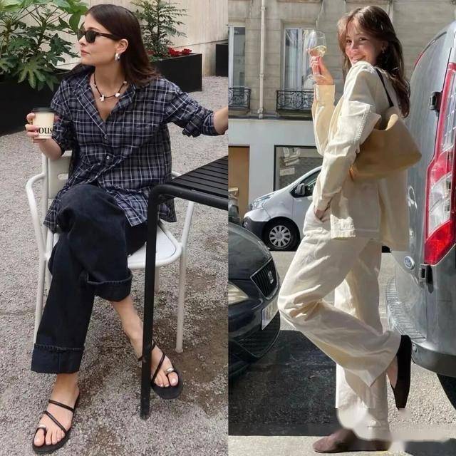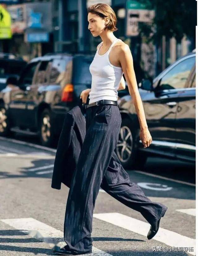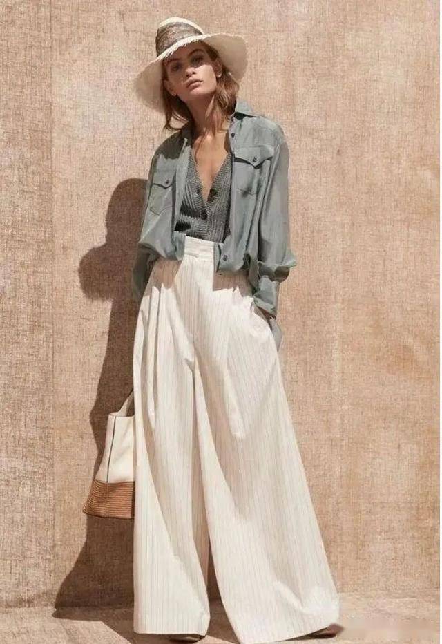 夏天就要来啦,可以试试拖地长度的阔腿裤搭配夹板平底鞋,清新中带着帅气感,又有一种特别慵懒随性的氛围。