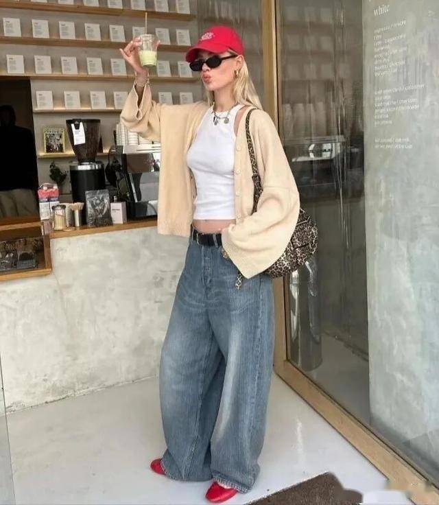 简单舒服的燕麦色毛衣外套,搭配牛仔阔腿裤,是一种很休闲很舒服的春日搭配,配一双红色的平底芭蕾舞鞋,增加了一抹俏丽精致的女人味,秀丽的平底鞋型,比厚底鞋显得更加轻盈。