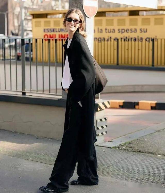 黑色长风衣,简洁大气中透着高级感,搭配黑色阔腿裤,增加了强大的气场,配一双黑色的平底乐福鞋,整体单一配色,高级感加满,又显高显瘦。