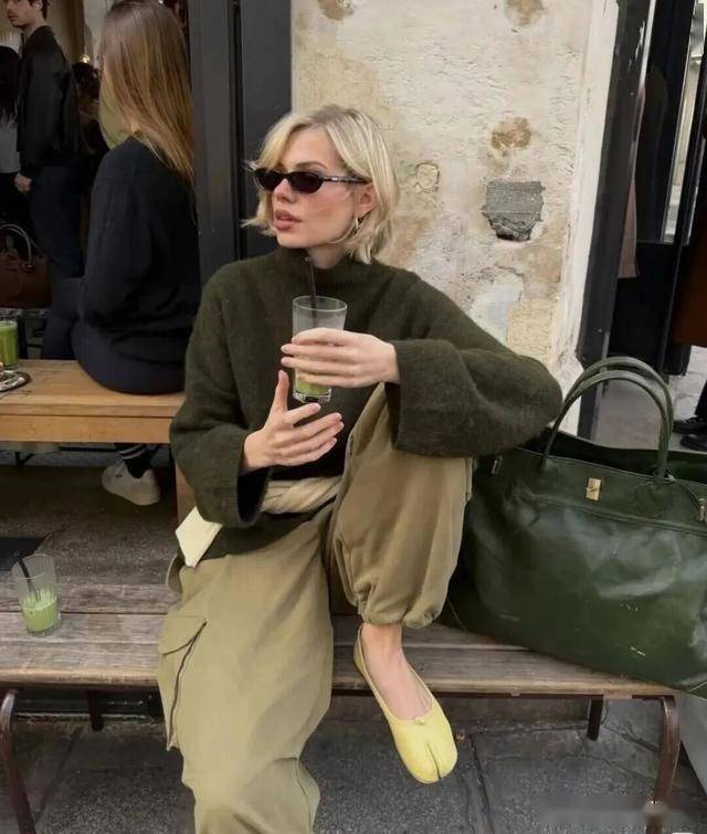复古绿色的毛衣搭配卡其色休闲阔腿裤,配一双鹅黄色的平底鞋,整体绿色系的搭配带着春日的轻盈感,充满了生命力,时髦又减龄。