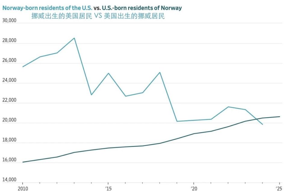 川普在竞选集会上曾多次谈到吸引挪威移民。但过去十年间,居住在美国的挪威人数量持续下降,并在2024年出现了具有象征意义的里程碑式翻转:如今居住在挪威的美国公民人数已经超过了居住在美国的挪威公民人数。