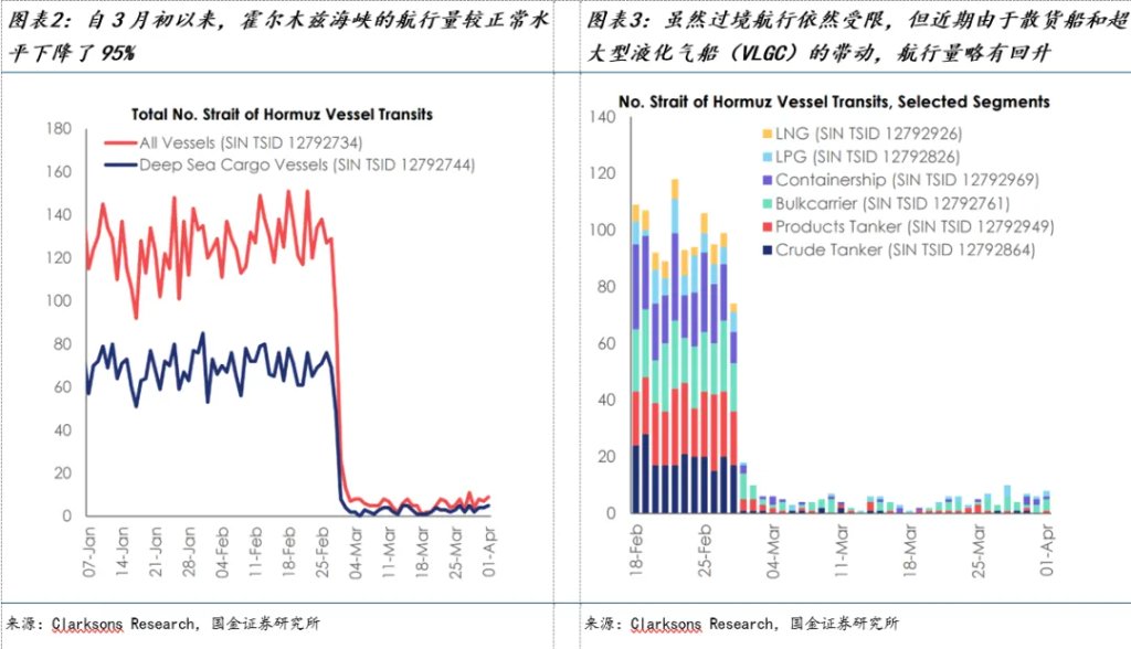 根据Clarksons Research,截至2026年4月2日的数据,霍尔木兹海峡过境量较冲突前下降约95%,日均过境船只从125艘跌至8艘,其中影子舰队占比从战前15%飙升至60%,意味着正常商业航运已基本撤离,留在通道里的是规避制裁的灰色运营,而非正常贸易秩序。