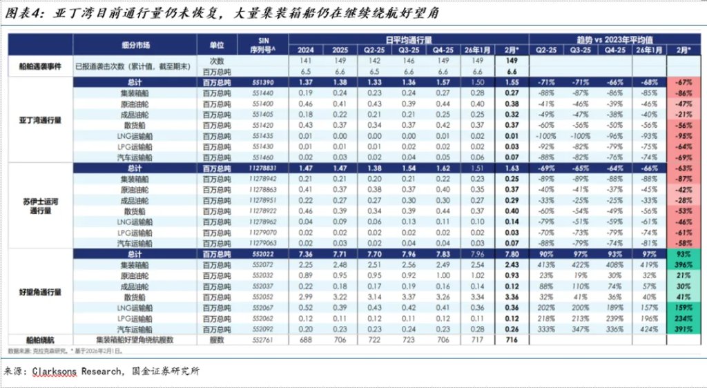 根据Clarksons Research 2026年2月数据,亚丁湾船舶日均通行量较2023年正常水平仍下降约70%。分船型来看,集装箱船通行量下降约86%,LNG运输船下降约95%,散货船下降约56%。与此同时,好望角通行量较2023年增加约93%,仍有约717艘集装箱船、69条航线维持绕行状态。尽管2025年底通行量曾出现小幅回升,但进入2026年后再度趋于平稳,并未延续复苏势头。马士基等头部班轮公司虽开始试探性恢复部分航线经苏伊士运河通行,但整体市场对大规模复航仍保持谨慎。