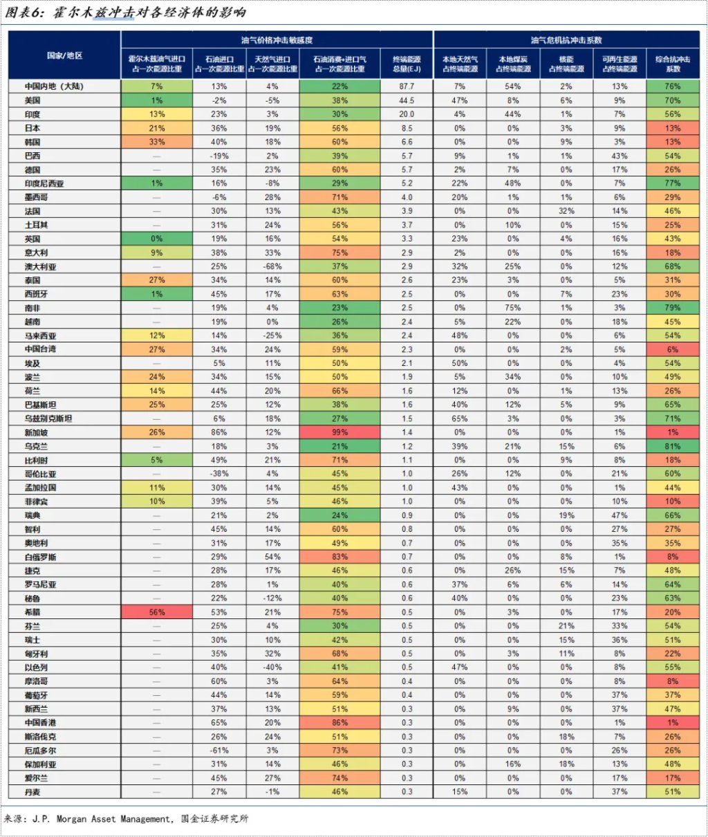欧洲更多体现为价格冲击通过成本链条向工业与消费端传导。希腊霍尔木兹直接依赖度高达56%,综合抗冲击系数仅20%,供给与价格压力并存。意大利直接依赖度仅9%,但油气总依赖度达75%,抗冲击系数18%,制造业与居民能源成本将随油价上行同步抬升。荷兰作为欧洲重要的能源转口枢纽,直接依赖14%,油气总依赖66%,抗冲击系数26%,价格传导压力同样不可忽视。