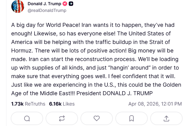 “世界和平的大日子!伊朗想要和平,他们已经受够了!同样,所有人也受够了!美利坚合众国将协助解决霍尔木兹海峡的拥堵问题。会有很多积极的行动!大家都会赚大钱。伊朗可以开始重建进程了。我们会满载各种物资,在那儿‘转悠转悠’,以确保万事顺遂。我对此信心十足。就像我们在美国正在经历的一样,这可能是中东的黄金时代!!!”