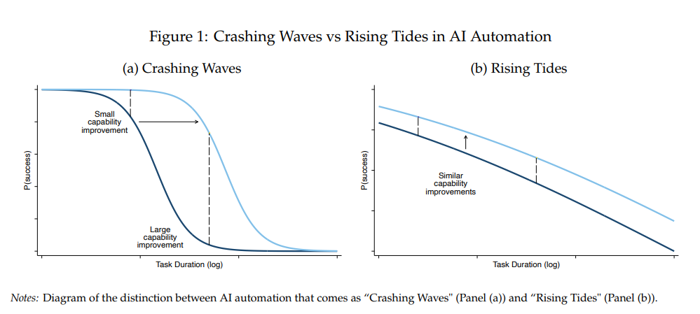 这项研究试图回答一个对投资者和政策制定者都至关重要的问题:AI能力的提升,究竟会以“巨浪”形式(Crashing Waves)——突然、集中地颠覆某类工作——还是以“潮汐”形式(Rising Tides)——广泛、渐进地抬升整体自动化水平?